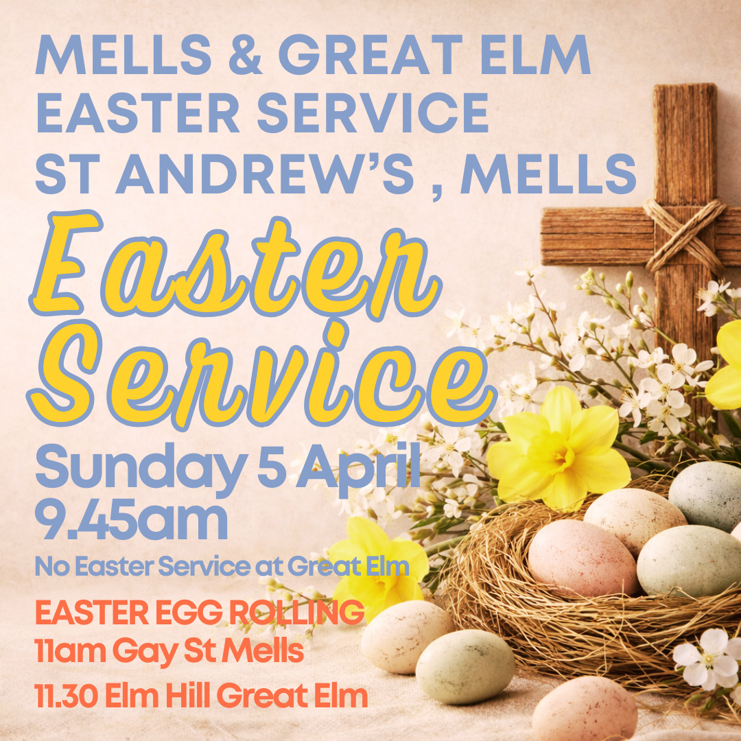 Service to start at 9.45 to allow time to go to the Easter Egg roll at 11 am in Gay Street, Mells and 11.30am on Elm Hill, Great Elm.